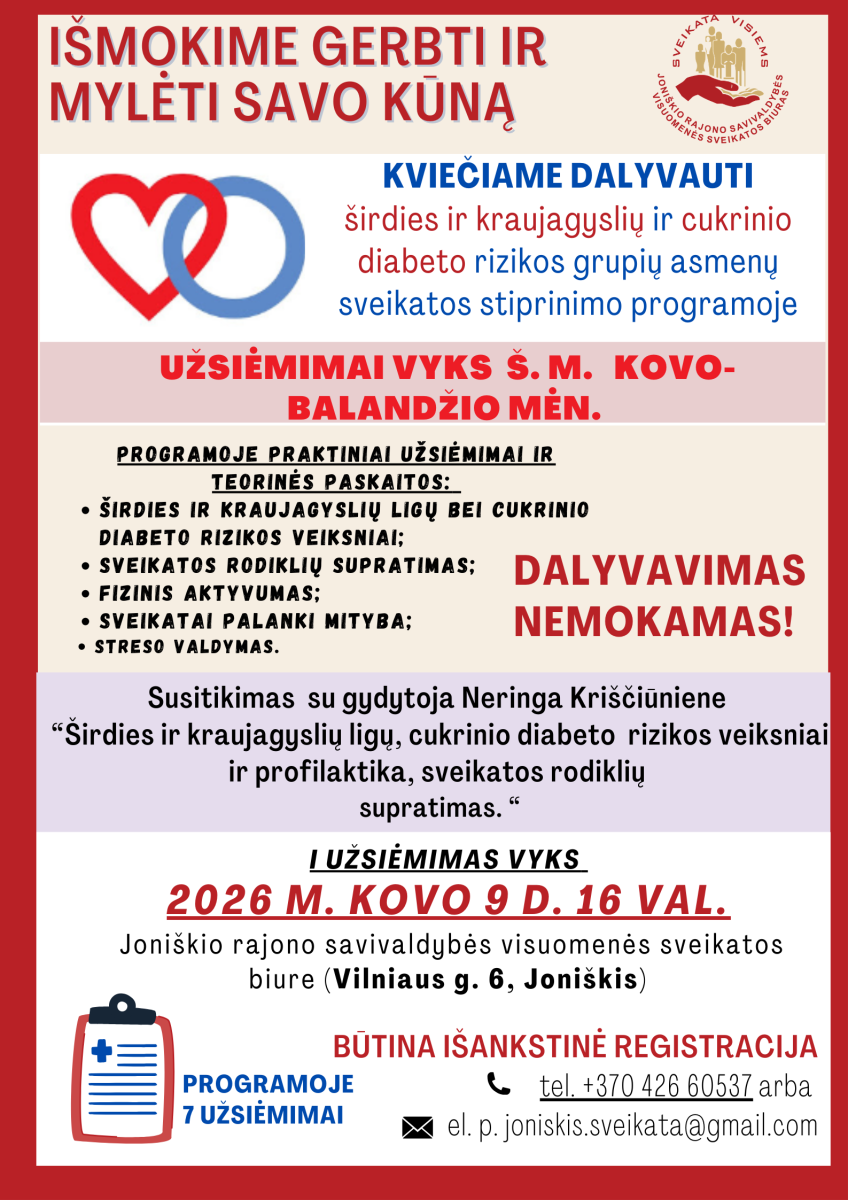 Joniškio rajono savivaldybės visuomenės sveikatos biuras kviečia visus pasirūpinti savo sveikata irregistruotis į nemokamą Sveikatos stiprinimo programą, skirtą širdies ir kraujagyslių ligų bei cukrinio diabeto profilaktikai.Programa skirta suaugusiems asmenims, kuriems nustatyta širdies ir kraujagyslių ligų ir (arba) cukrinio diabeto rizika, taip pat savanoriškai besikreipiantiems dėl dalyvavimo Programoje asmenims. Programos metu organizuojami teoriniai ir praktiniai sveikos gyvensenos užsiėmimai, skirti mažinti širdies ir kraujagyslių ligų bei diabeto riziką. Gyventojams dalyvavimas Programoje yra nemokamas.